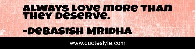 This page presents the quote "Always love more than they deserve.". Author of this quote is Debasish Mridha. This quote is about love-more-than-they-deserve, love, philosophy, debasish-mridha, quotes, debasish-mridha-md, inspirational, enthusiasm, how-much-to-love,.