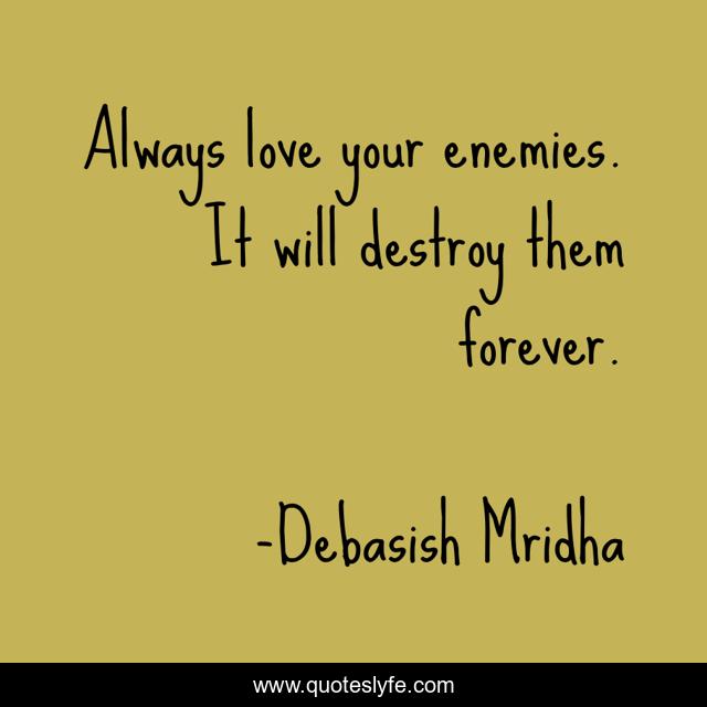 This page presents the quote "Always love your enemies. It will destroy them forever.". Author of this quote is Debasish Mridha. This quote is about forever, debasish, love, mridha, philosophy, life, destroy, affection, enemies,.