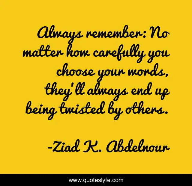 This page presents the quote "Always remember: No matter how carefully you choose your words, they'll always end up being twisted by others.". Author of this quote is Ziad K. Abdelnour. This quote is about twist, words,.