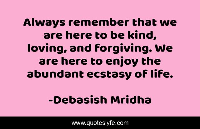 This page presents the quote "Always remember that we are here to be kind, loving, and forgiving. We are here to enjoy the abundant ecstasy of life.". Author of this quote is Debasish Mridha. This quote is about life-wisdom, philosophy, debasish-mridha, be-kind, ecstasy-of-life, quotes, be-forgiving, inspirational, enthusiasm,.