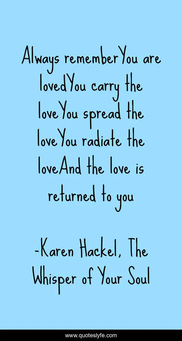 This page presents the quote "Always rememberYou are lovedYou carry the loveYou spread the loveYou radiate the loveAnd the love is returned to you". Author of this quote is Karen Hackel, The Whisper of Your Soul. This quote is about living, self-love, love, affection, new-age,.
