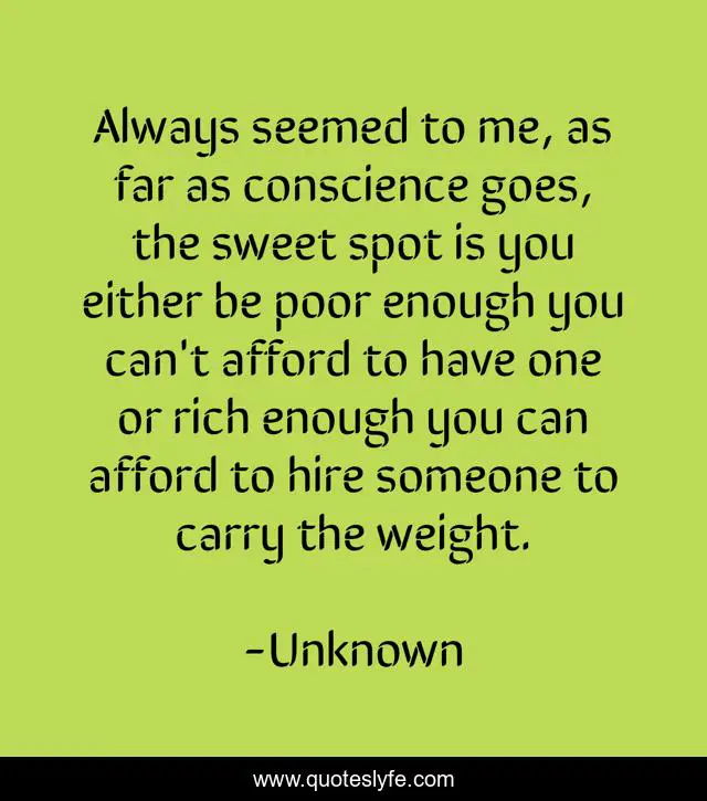 This page presents the quote "Always seemed to me, as far as conscience goes, the sweet spot is you either be poor enough you can't afford to have one or rich enough you can afford to hire someone to carry the weight.". Author of this quote is Unknown. .
