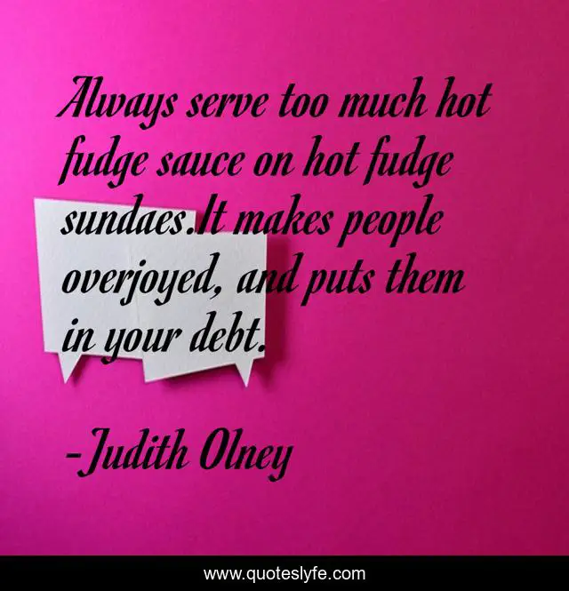 This page presents the quote "Always serve too much hot fudge sauce on hot fudge sundaes.It makes people overjoyed, and puts them in your debt.". Author of this quote is Judith Olney. This quote is about food, chocolate,.