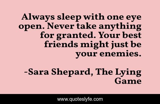 This page presents the quote "Always sleep with one eye open. Never take anything for granted. Your best friends might just be your enemies.". Author of this quote is Sara Shepard, The Lying Game. This quote is about lies, the-lying-game, friends, fake-people,.