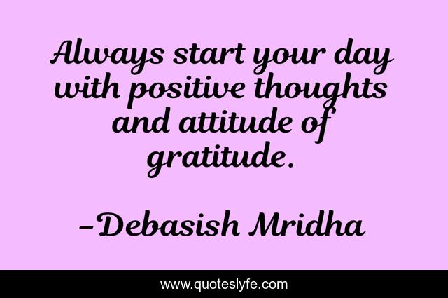 This page presents the quote "Always start your day with positive thoughts and attitude of gratitude.". Author of this quote is Debasish Mridha. This quote is about life, love, knowledge, inspirational, intelligence, philosophy, wisdom, quotes, affection,.