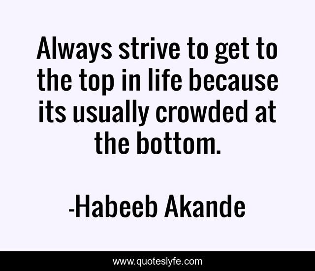 This page presents the quote "Always strive to get to the top in life because its usually crowded at the bottom.". Author of this quote is Habeeb Akande. This quote is about ambition, determination, strive,.