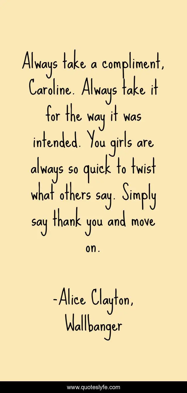 This page presents the quote "Always take a compliment, Caroline. Always take it for the way it was intended. You girls are always so quick to twist what others say. Simply say thank you and move on.". Author of this quote is Alice Clayton, Wallbanger. This quote is about compliments, wisdom,.