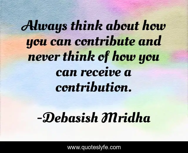 This page presents the quote "Always think about how you can contribute and never think of how you can receive a contribution.". Author of this quote is Debasish Mridha. This quote is about miraboli, oscar-wilde, how-can-you-contribute, philosophy, debasish-mridha, receive-a-contribution, quotes, buddha, debasish-mridha-md,.