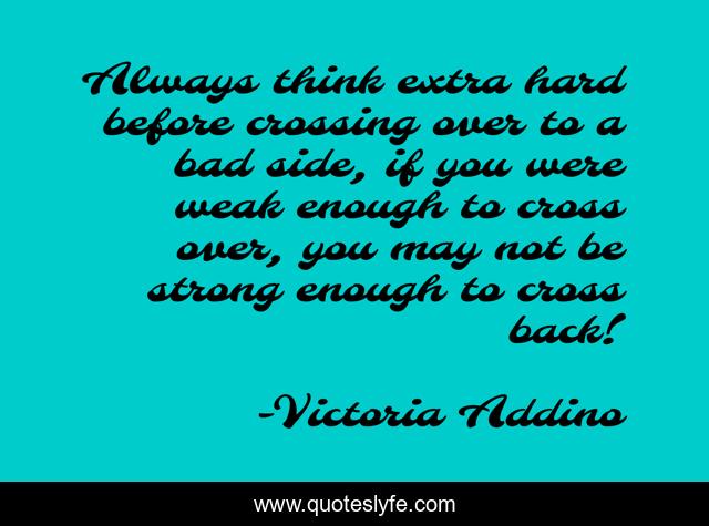 This page presents the quote "Always think extra hard before crossing over to a bad side, if you were weak enough to cross over, you may not be strong enough to cross back!". Author of this quote is Victoria Addino. This quote is about strength, struggles, positive-thinking, lesson-life, pier-pressure, structure,.