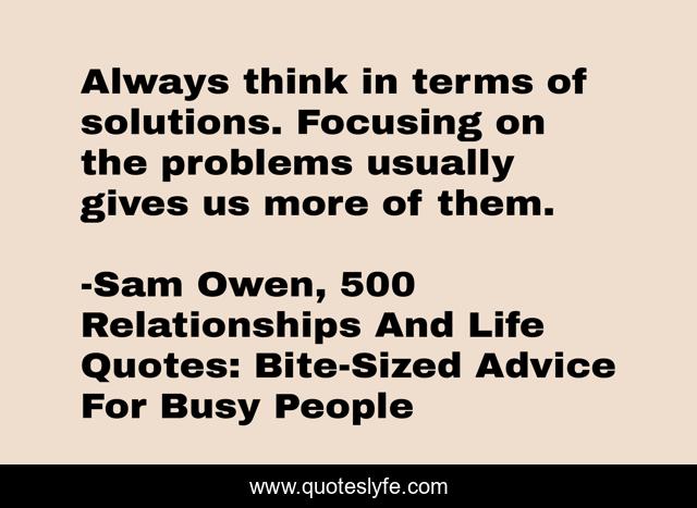 "Sam Owen, 500 Relationships And Life Quotes: Bite-Sized Advice For Busy People Quotes." Quoteslyfe.com, 2025. Mon. 15 Dec. 2025. <https://www.quoteslyfe.com/quote/Always-think-in-terms-of-solutions-Focusing-137788>.