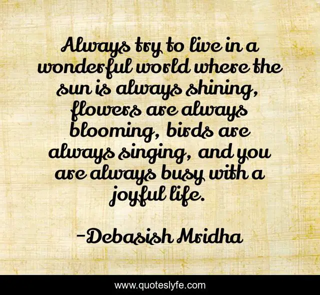 This page presents the quote "Always try to live in a wonderful world where the sun is always shining, flowers are always blooming, birds are always singing, and you are always busy with a joyful life.". Author of this quote is Debasish Mridha. This quote is about joyful-life, birds-are-singing, oscar-wilde, wonderful-world, philosophy, debasish-mridha, tagore, quotes, miraboli,.