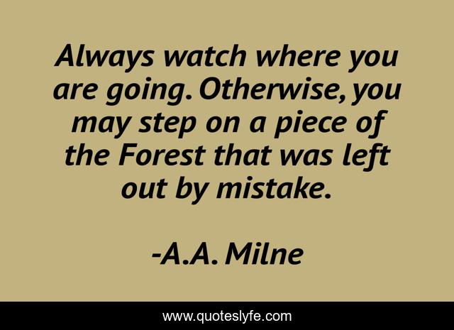 This page presents the quote "Always watch where you are going. Otherwise, you may step on a piece of the Forest that was left out by mistake.". Author of this quote is A.A. Milne. .