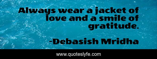 This page presents the quote "Always wear a jacket of love and a smile of gratitude.". Author of this quote is Debasish Mridha. This quote is about life, love, knowledge, inspirational, intelligence, philosophy, wisdom, quotes, affection,.