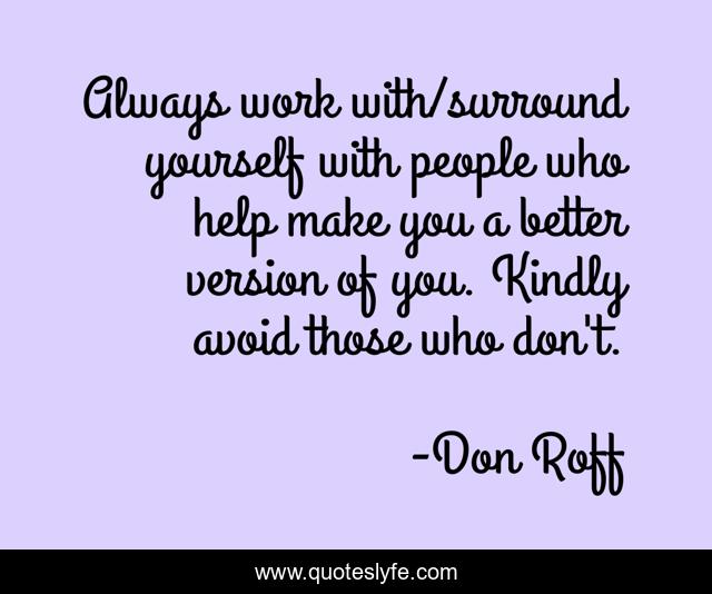 This page presents the quote "Always work with/surround yourself with people who help make you a better version of you. Kindly avoid those who don't.". Author of this quote is Don Roff. This quote is about kind, help, people, work, surround, yourself, better, version, inspiration,.