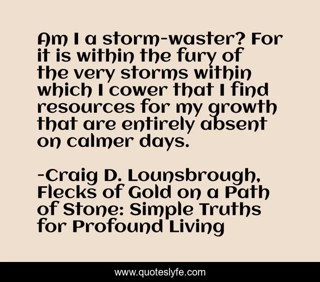 This page presents the quote "Am I a storm-waster? For it is within the fury of the very storms within which I cower that I find resources for my growth that are entirely absent on calmer days.". Author of this quote is Craig D. Lounsbrough, Flecks of Gold on a Path of Stone: Simple Truths for Profound Living. This quote is about tribulations, personal-growth, fury, cower, storms, days, opportunities, growth, calm,.