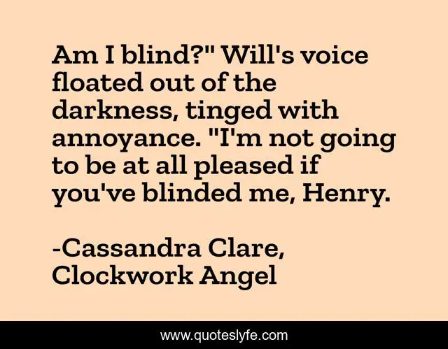 This page presents the quote "Am I blind?" Will's voice floated out of the darkness, tinged with annoyance. "I'm not going to be at all pleased if you've blinded me, Henry.". Author of this quote is Cassandra Clare, Clockwork Angel. .