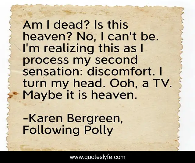 "Karen Bergreen, Following Polly Quotes." Quoteslyfe.com, 2025. Sat. 06 Dec. 2025. <https://www.quoteslyfe.com/quote/Am-I-dead-Is-this-heaven-No-183444>.
