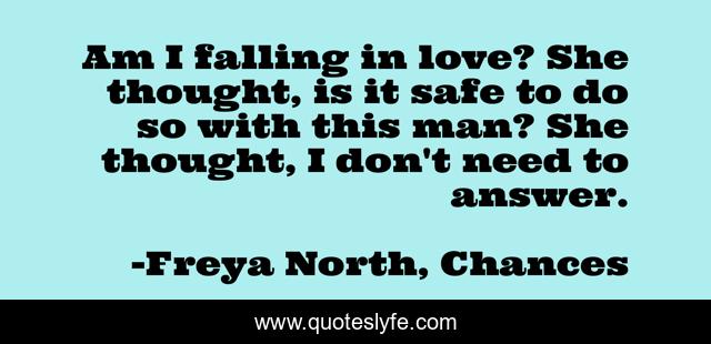 This page presents the quote "Am I falling in love? She thought, is it safe to do so with this man? She thought, I don't need to answer.". Author of this quote is Freya North, Chances. .