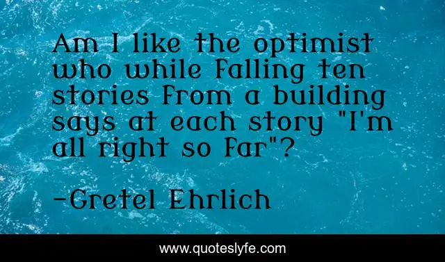 This page presents the quote "Am I like the optimist who while falling ten stories from a building says at each story "I'm all right so far"?". Author of this quote is Gretel Ehrlich. This quote is about positive, confidence,.
