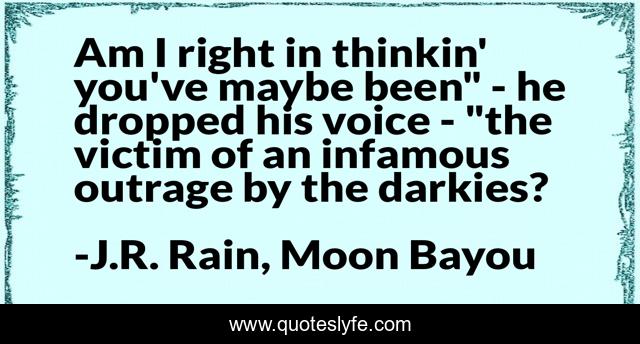 This page presents the quote "Am I right in thinkin' you've maybe been" - he dropped his voice - "the victim of an infamous outrage by the darkies?". Author of this quote is J.R. Rain, Moon Bayou. This quote is about new-orleans, vampires, shifters, time-travel, paranormal, witches, voodoo,.