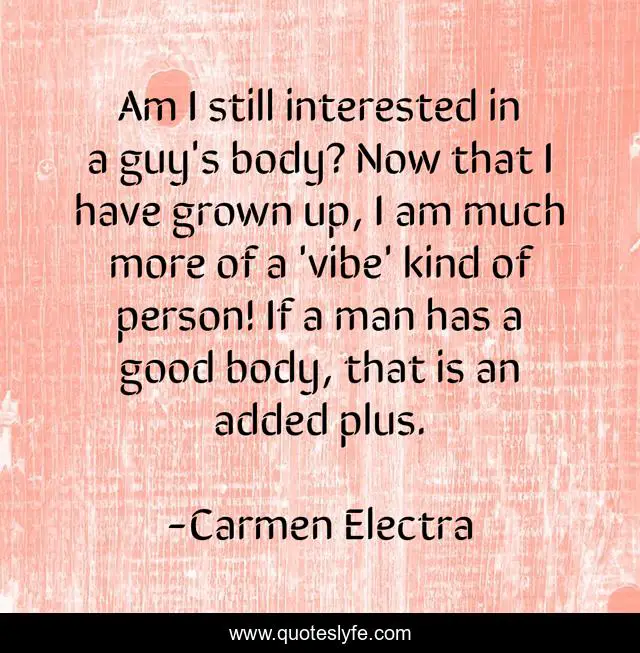 This page presents the quote "Am I still interested in a guy's body? Now that I have grown up, I am much more of a 'vibe' kind of person! If a man has a good body, that is an added plus.". Author of this quote is Carmen Electra. This quote is about good, man,.