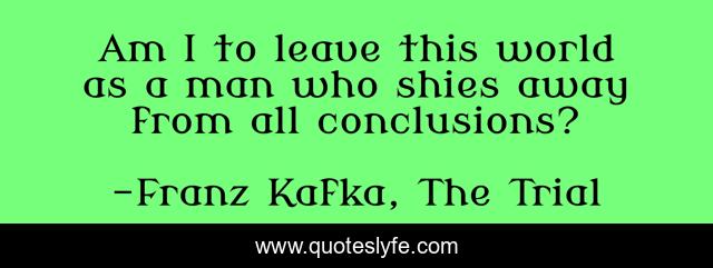 This page presents the quote "Am I to leave this world as a man who shies away from all conclusions?". Author of this quote is Franz Kafka, The Trial. This quote is about existentialism, post-modernism, nihilism,.