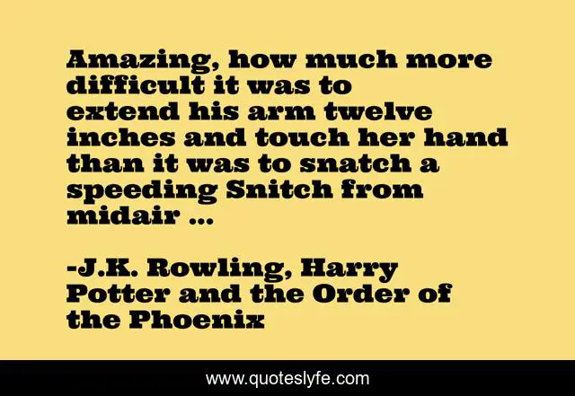This page presents the quote "Amazing, how much more difficult it was to extend his arm twelve inches and touch her hand than it was to snatch a speeding Snitch from midair ...". Author of this quote is J.K. Rowling, Harry Potter and the Order of the Phoenix. .