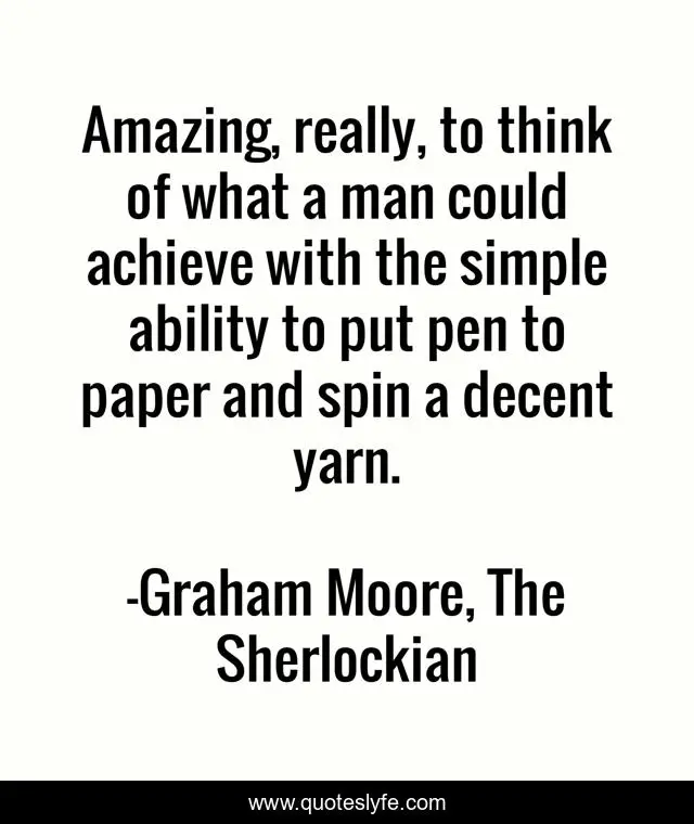 This page presents the quote "Amazing, really, to think of what a man could achieve with the simple ability to put pen to paper and spin a decent yarn.". Author of this quote is Graham Moore, The Sherlockian. This quote is about sherlock-holmes, literature, sherlockian, writing,.