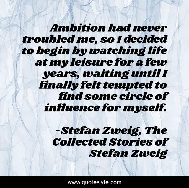 This page presents the quote "Ambition had never troubled me, so I decided to begin by watching life at my leisure for a few years, waiting until I finally felt tempted to find some circle of influence for myself.". Author of this quote is Stefan Zweig, The Collected Stories of Stefan Zweig. This quote is about fantastic-night, waiting, ambition,.