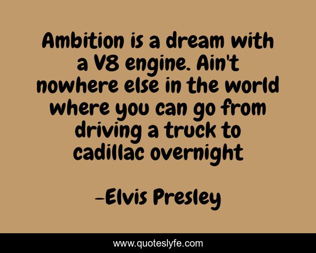 This page presents the quote "Ambition is a dream with a V8 engine. Ain't nowhere else in the world where you can go from driving a truck to cadillac overnight". Author of this quote is Elvis Presley. This quote is about enthusiasm, life, music, inspirational, ambition,.