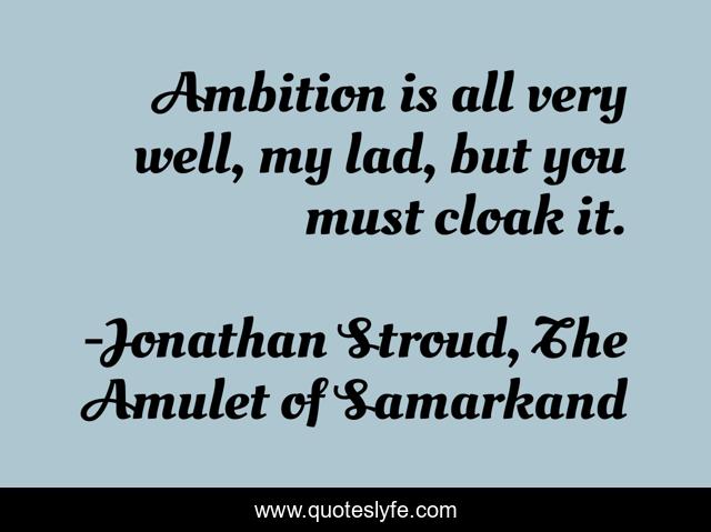 This page presents the quote "Ambition is all very well, my lad, but you must cloak it.". Author of this quote is Jonathan Stroud, The Amulet of Samarkand. This quote is about jonathan-stroud, amulet-of-samarkand, bartimaeus-trilogy, ambition,.