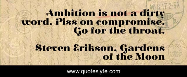 This page presents the quote "Ambition is not a dirty word. Piss on compromise. Go for the throat.". Author of this quote is Steven Erikson, Gardens of the Moon. This quote is about compromise, ambition,.