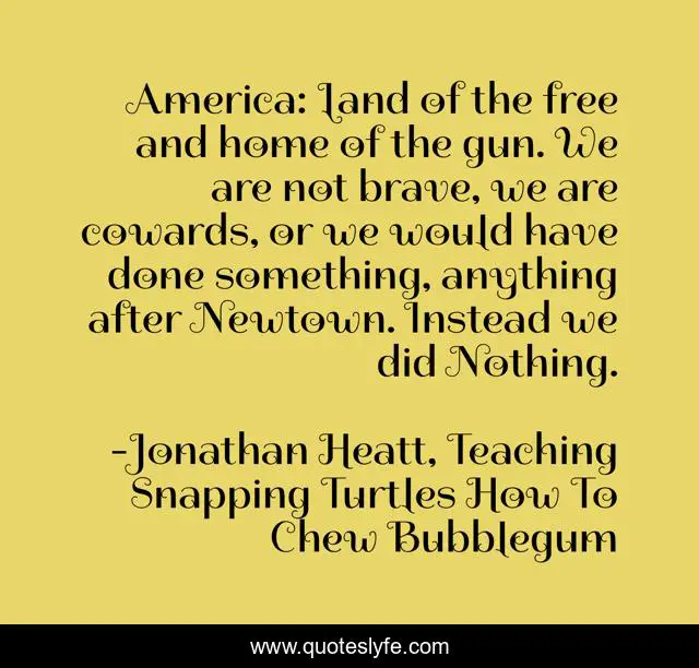 This page presents the quote "America: Land of the free and home of the gun. We are not brave, we are cowards, or we would have done something, anything after Newtown. Instead we did Nothing.". Author of this quote is Jonathan Heatt, Teaching Snapping Turtles How To Chew Bubblegum. This quote is about gun-control, america, gun-violence, guns, newtown,.