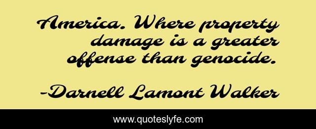 This page presents the quote "America. Where property damage is a greater offense than genocide.". Author of this quote is Darnell Lamont Walker. This quote is about riot, racism, fighting, american, race, genocide, america,.