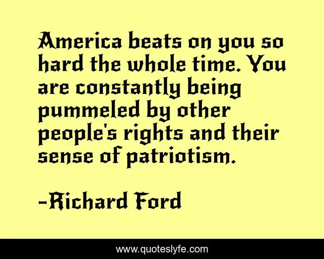This page presents the quote "America beats on you so hard the whole time. You are constantly being pummeled by other people's rights and their sense of patriotism.". Author of this quote is Richard Ford. This quote is about america, time, people,.