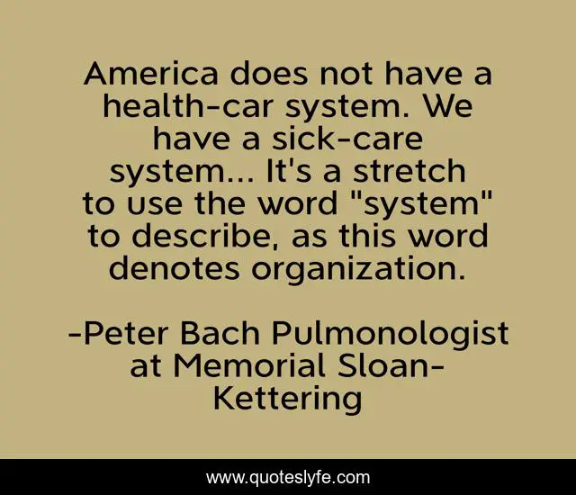 This page presents the quote "America does not have a health-car system. We have a sick-care system... It's a stretch to use the word "system" to describe, as this word denotes organization.". Author of this quote is Peter Bach Pulmonologist at Memorial Sloan-Kettering. This quote is about health, health-care-in-the-united-states, healthcare,.