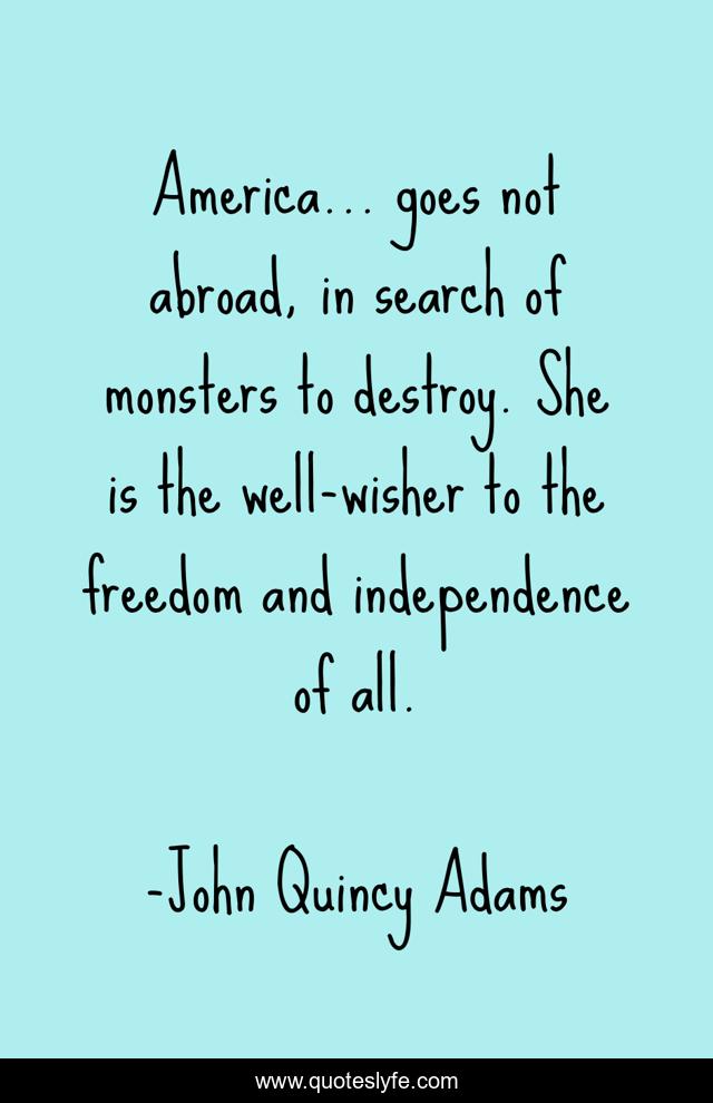 This page presents the quote "America... goes not abroad, in search of monsters to destroy. She is the well-wisher to the freedom and independence of all.". Author of this quote is John Quincy Adams. This quote is about freedom, peace, liberty, imperialism, noninterventionism, isolationism, independence,.