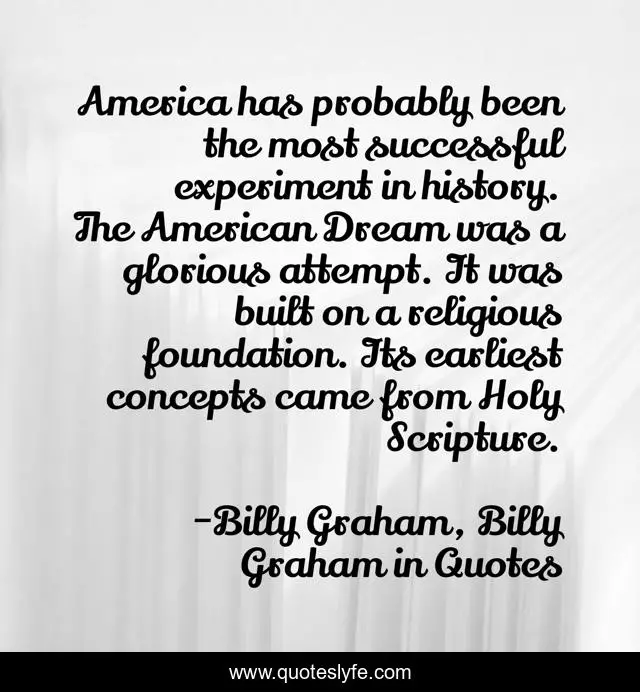 This page presents the quote "America has probably been the most successful experiment in history. The American Dream was a glorious attempt. It was built on a religious foundation. Its earliest concepts came from Holy Scripture.". Author of this quote is Billy Graham, Billy Graham in Quotes. This quote is about america, billy-graham,.