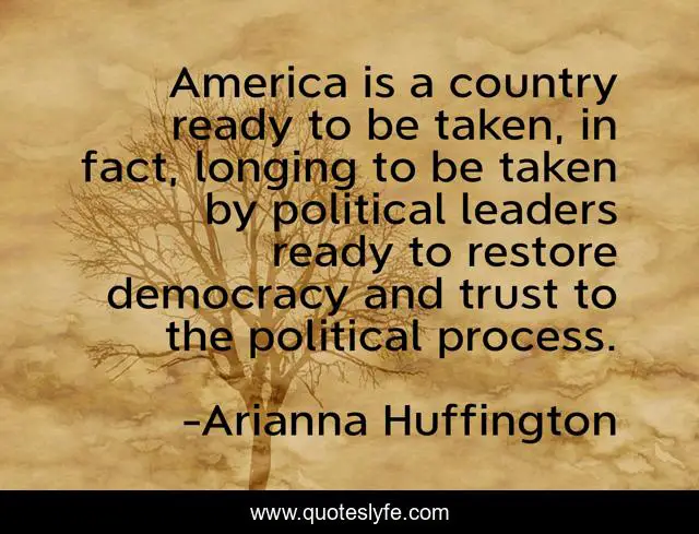 This page presents the quote "America is a country ready to be taken, in fact, longing to be taken by political leaders ready to restore democracy and trust to the political process.". Author of this quote is Arianna Huffington. This quote is about america, democracy,.
