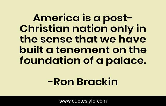 This page presents the quote "America is a post-Christian nation only in the sense that we have built a tenement on the foundation of a palace.". Author of this quote is Ron Brackin. This quote is about liberals-and-power, american-exceptionalism, historical-revisionists, america, progressives,.