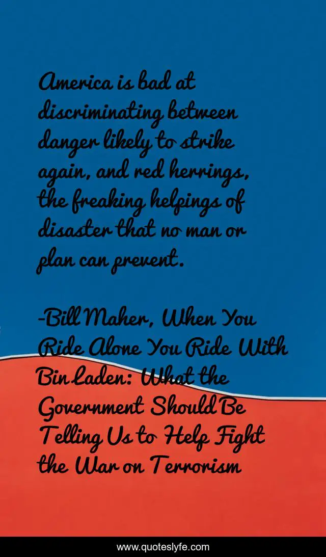 "Bill Maher, When You Ride Alone You Ride With Bin Laden: What the Government Should Be Telling Us to Help Fight the War on Terrorism Quotes." Quoteslyfe.com, 2025. Fri. 05 Dec. 2025. <https://www.quoteslyfe.com/quote/America-is-bad-at-discriminating-between-danger-191831>.