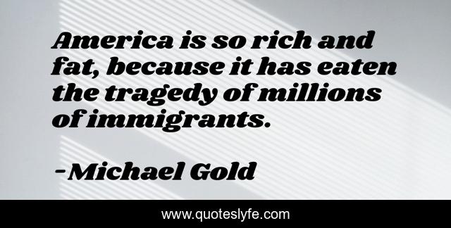This page presents the quote "America is so rich and fat, because it has eaten the tragedy of millions of immigrants.". Author of this quote is Michael Gold. This quote is about america, immigration,.
