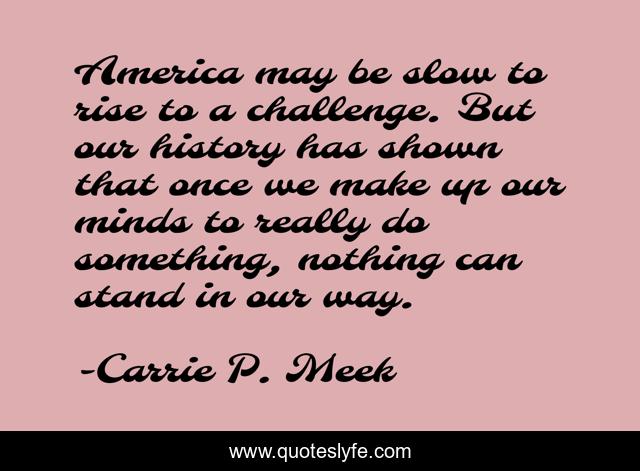 This page presents the quote "America may be slow to rise to a challenge. But our history has shown that once we make up our minds to really do something, nothing can stand in our way.". Author of this quote is Carrie P. Meek. This quote is about challenge, america, rise,.