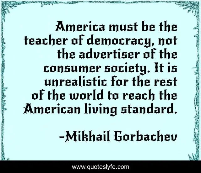 This page presents the quote "America must be the teacher of democracy, not the advertiser of the consumer society. It is unrealistic for the rest of the world to reach the American living standard.". Author of this quote is Mikhail Gorbachev. This quote is about society, america, world,.