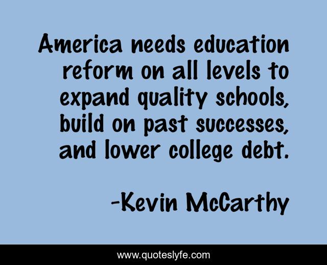 This page presents the quote "America needs education reform on all levels to expand quality schools, build on past successes, and lower college debt.". Author of this quote is Kevin McCarthy. This quote is about past, america, college,.