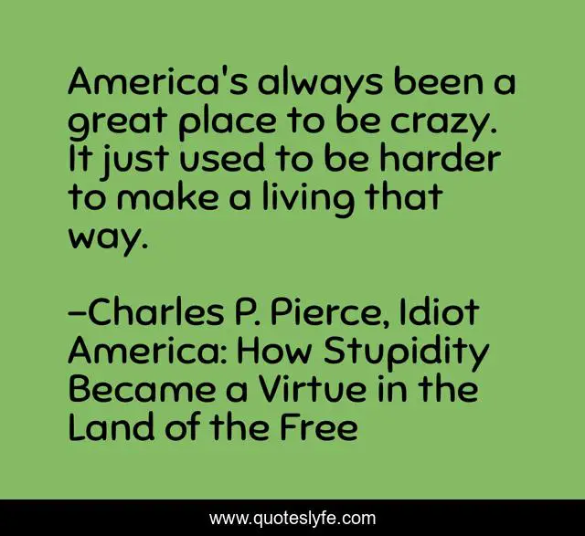 This page presents the quote "America's always been a great place to be crazy. It just used to be harder to make a living that way.". Author of this quote is Charles P. Pierce, Idiot America: How Stupidity Became a Virtue in the Land of the Free. This quote is about crazy, america,.