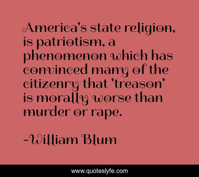 This page presents the quote "America's state religion, is patriotism, a phenomenon which has convinced many of the citizenry that 'treason' is morally worse than murder or rape.". Author of this quote is William Blum. This quote is about religion, america, worse,.