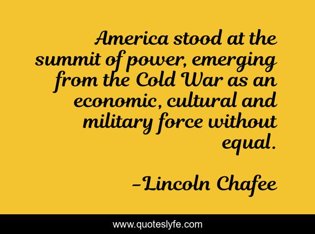This page presents the quote "America stood at the summit of power, emerging from the Cold War as an economic, cultural and military force without equal.". Author of this quote is Lincoln Chafee. This quote is about military, america, power,.