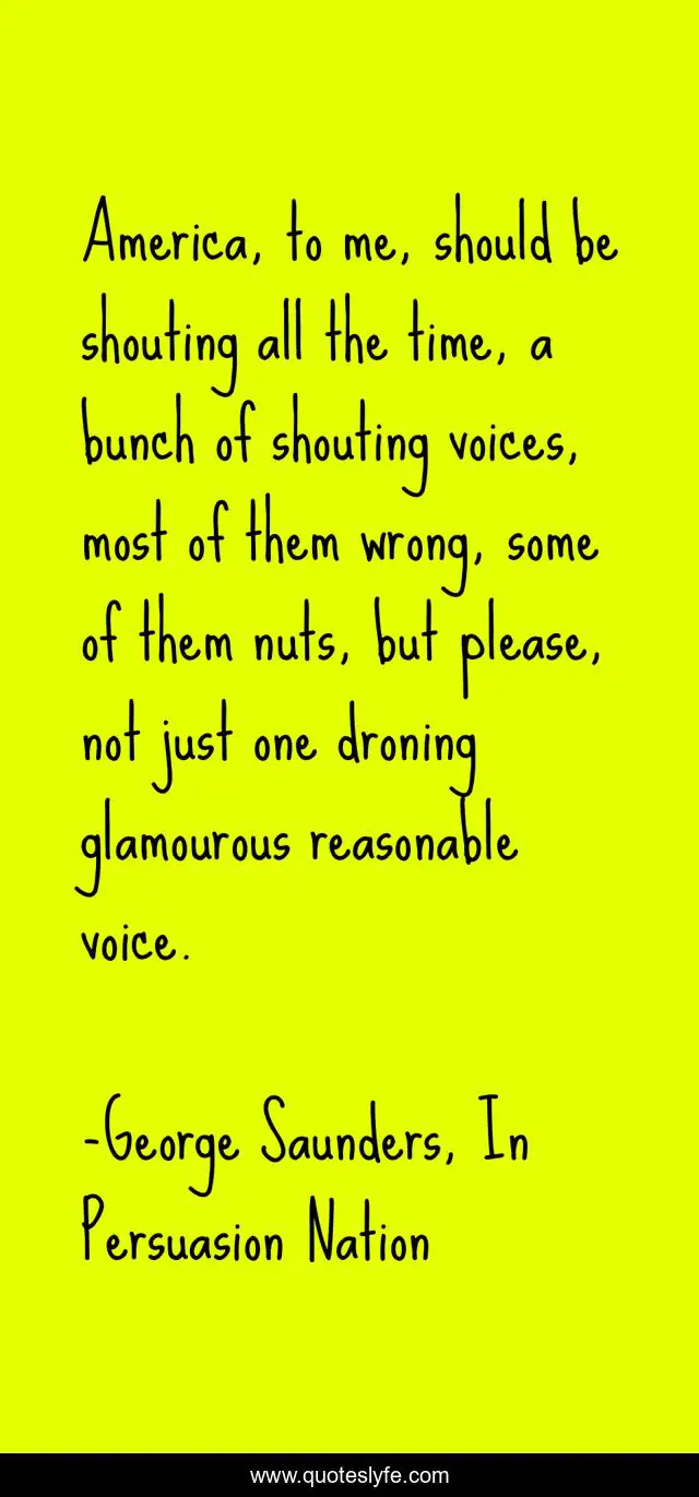 This page presents the quote "America, to me, should be shouting all the time, a bunch of shouting voices, most of them wrong, some of them nuts, but please, not just one droning glamourous reasonable voice.". Author of this quote is George Saunders, In Persuasion Nation. .