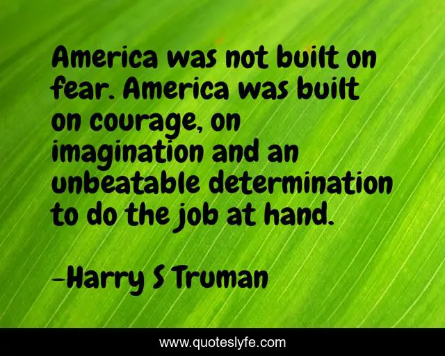 This page presents the quote "America was not built on fear. America was built on courage, on imagination and an unbeatable determination to do the job at hand.". Author of this quote is Harry S Truman. This quote is about courage, patriotism,.